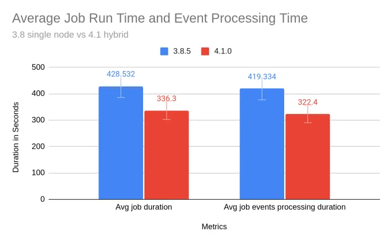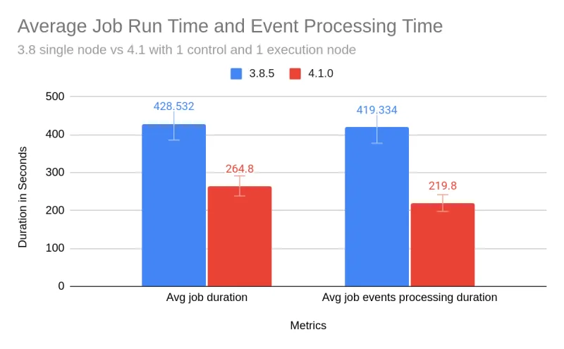 When comparing a Single Node Ansible Tower 3.8 with an external database versus automation controller 4.1 Single Hybrid Node with an external database, the average job duration decreased by about 22% and the job events processing time decreased by about 23%.