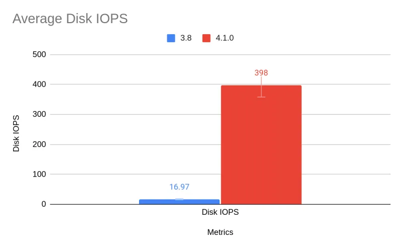 One important aspect of all these performance gains is how much added pressure it puts on resources in terms of CPU, RAM and Disk IOPS. In automation controller 4.1 there is a significant increase in average disk IOPS as compared to Ansible Tower 3.8. In the above results, automation controller 4.1 is running jobs much faster and hence it is writing the job events on disk much faster as well. With the introduction of the receptor, which is an overlay network intended to ease the distribution of work across a collection of execution nodes, those job events are getting written to the disk temporarily on the control node and that is why you see the increase in the average disk IOPS.