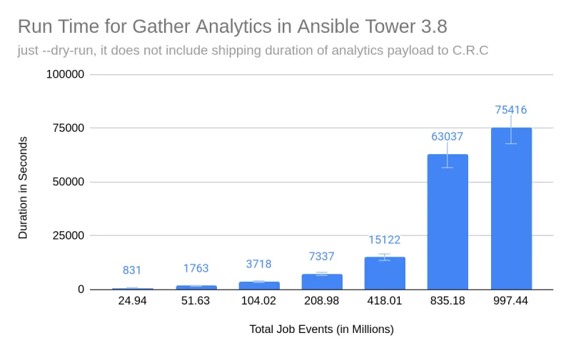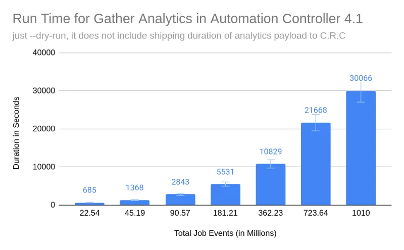 The job events table partitioning also had a major performance impact on the Automation Analytics. Automation controller is able to gather these analytics much faster in automation controller 4.1. We compared the gather analytics in Ansible Tower 3.8 and automation controller 4.1, with a different number of job events in the table. There was a performance improvement of about 60% in the gather analytics runtime.