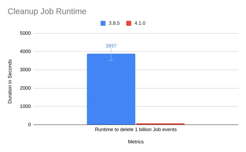 Cleanup job assists in the deleting old data from the controller, including system tracking information, tokens, job histories, and activity streams. You can use this if you have specific retention policies or need to decrease the storage used by your controller database. With automation controller 4.0, the job events table was horizontally partitioned. Prior to automation controller 4.0, it was one table that would exponentially increase as you ran more jobs. As the table increased, it caused various performance issues in Ansible Tower. One of those issues was long running cleanup jobs. With the introduction of horizontal partitioning, there was significant performance improvement in the cleanup jobs runtime. To measure this performance gain, we created an Ansible Tower 3.8 instance and an automation controller 4.1 instance. We then created a database with 1 billion job events, ran the cleanup jobs and we observed the runtime of the cleanup jobs. The result was a 98% decrease in the cleanup job runtime.