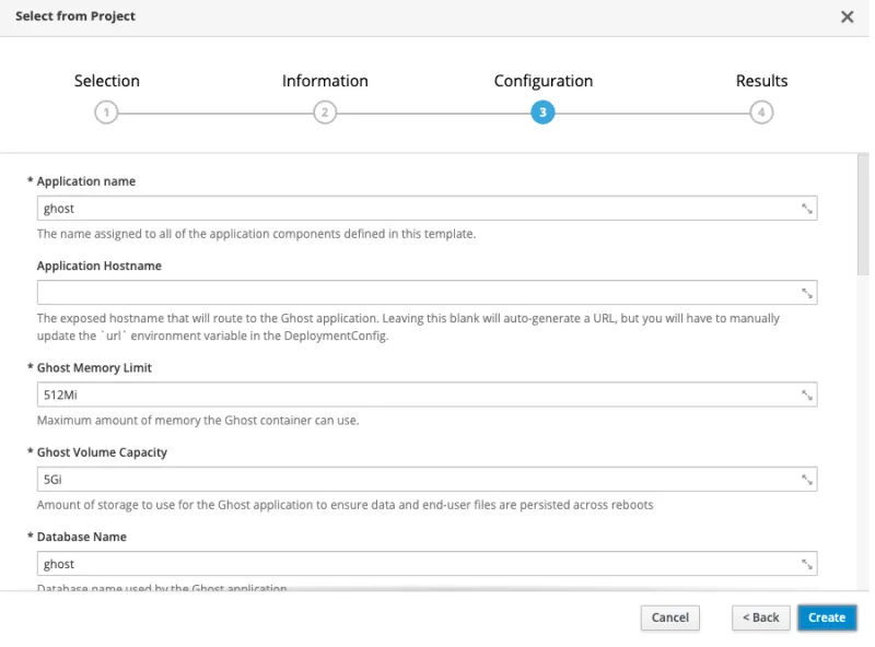 Now you can continue on the command line with oc new-app --template=ghost-template or you can deploy this through the web console