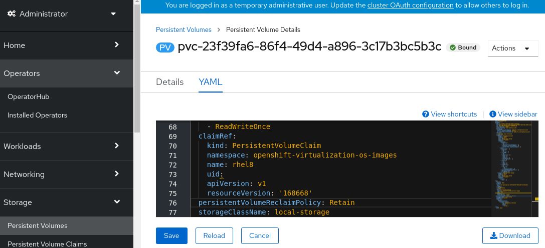 This change is done, using an administrative user account, by editing the YAML configuration for the PV. Navigate to [Storage ⮞ Persistent Volumes] and select [Edit Persistent Volume] from the kebab menu to the right of the new PV.