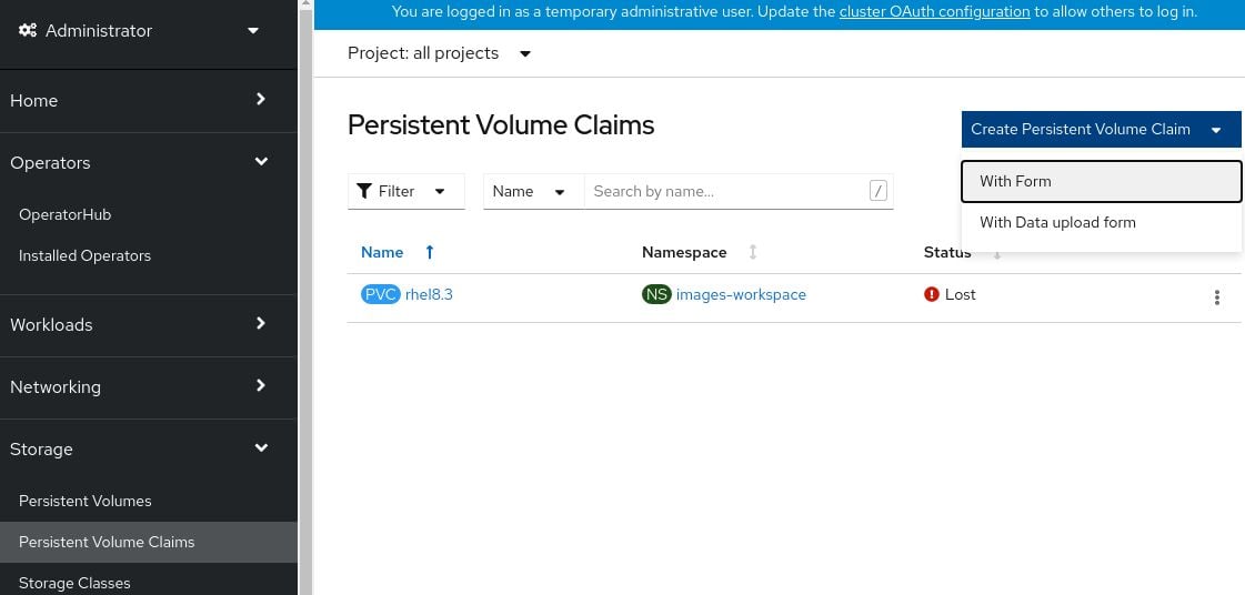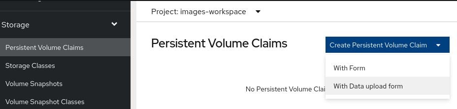 Using the web interface, navigate to [Storage ⮞ Persistent Volume Claims] and select [Create Persistent Volume Claim ⮞ With Data Upload Form]