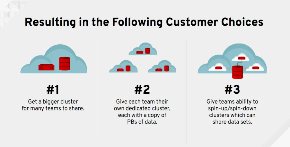 - However, each separate analytics cluster typically has its own, non-shared HDFS data store - creating data silos.