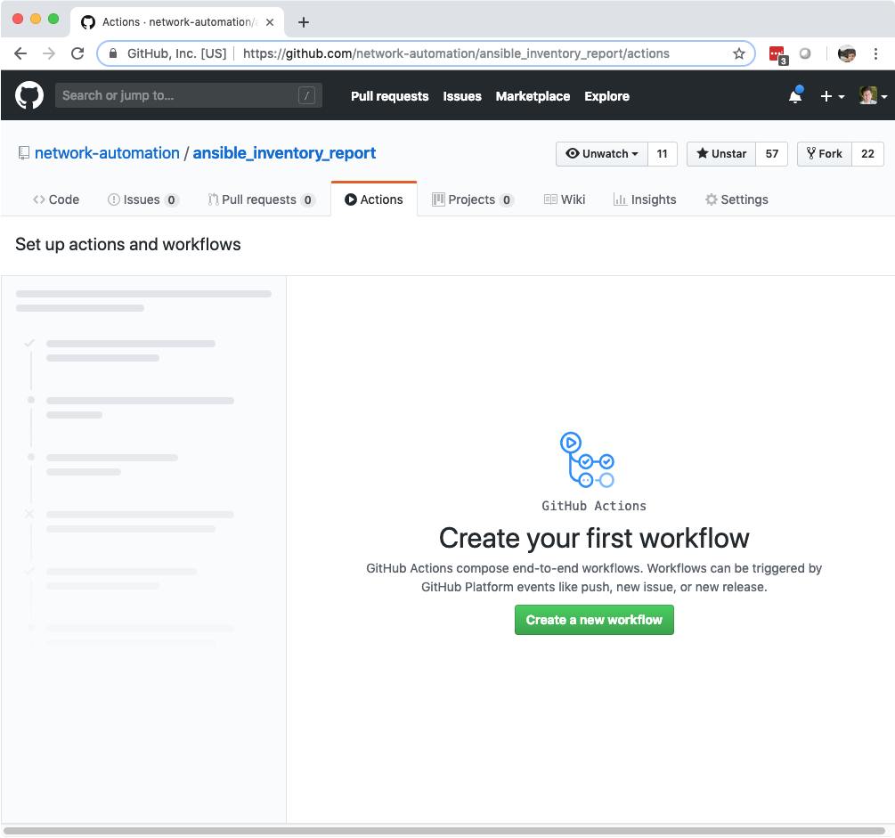 Now that I have HTTPie working I can start building my Github Actions workflow. When you first click on the Github Actions tab on a repo, you will get a blank page with a “Create a new workflow” green button: